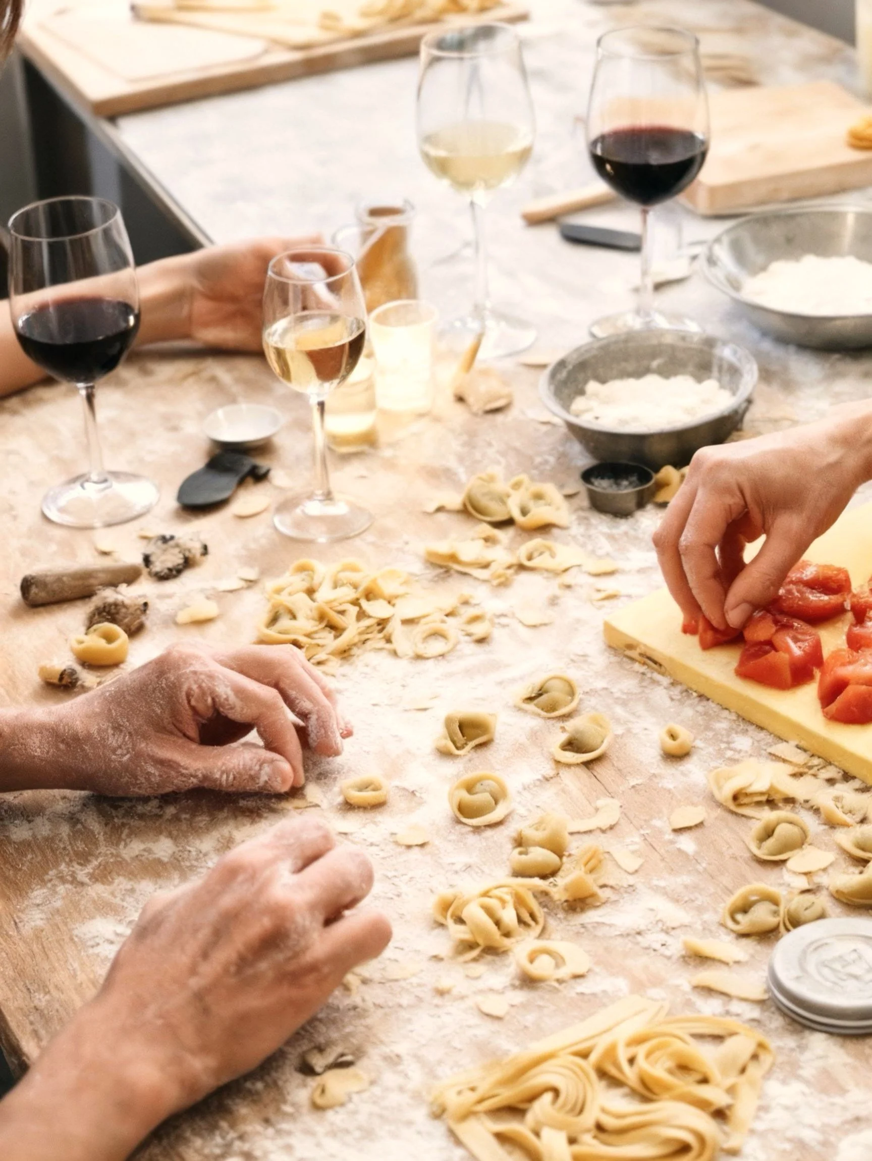 Flour on your hands, wine in your glass, and a table set for a leisurely noon experience shaped around food and craft.